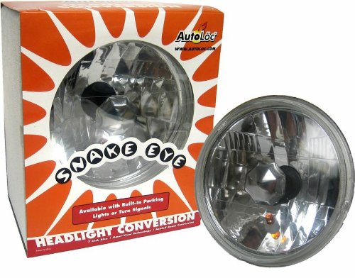AutoLoc Snake Eye Headlight Conversion replaces the popular seven inch sealed beam round headlights used in many cars and trucks. Uses a replaceable H4 bulb to give you the best visibility possible. Features AutoLoc's exclusive omni-view technology to ensure maximum light output. Easy installation even for the weekend mechanic. The snake eye headlight is constructed of a lightweight plastic case with a glass lens. Includes removable rubber seal to prevent moisture build up and allow easy access when replacing H4 bulbs.Check its out related products of AutoLoc HL1P Snake Eye Head Light with Parking Light